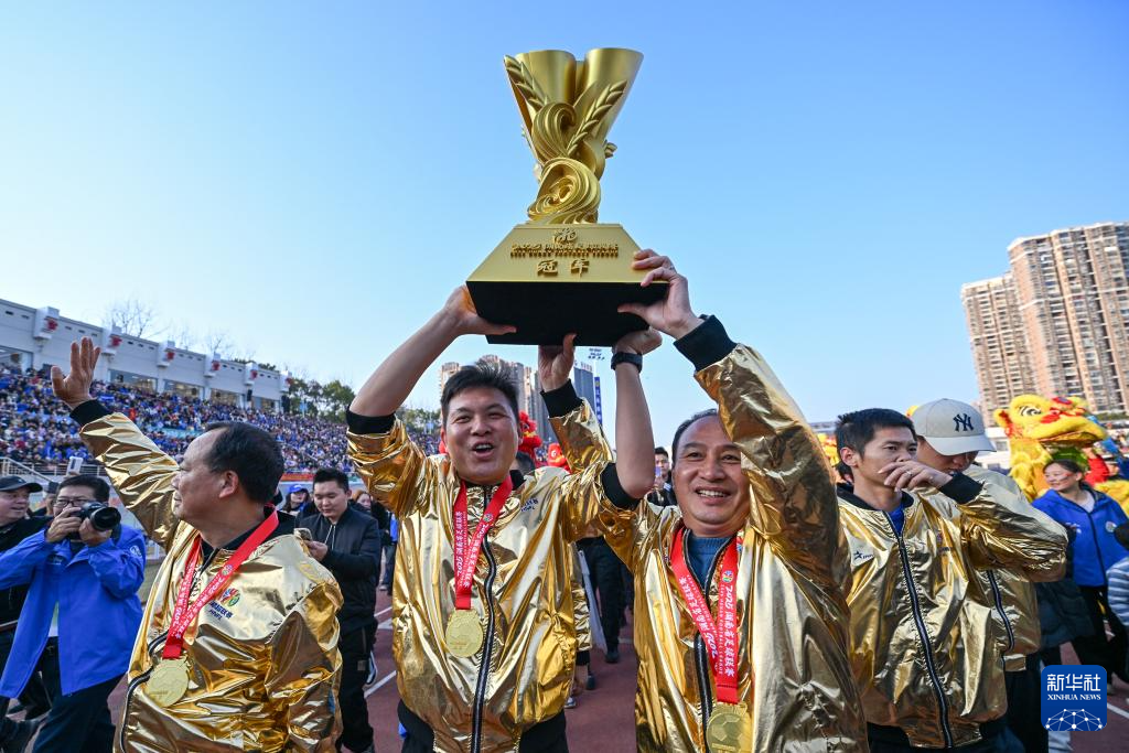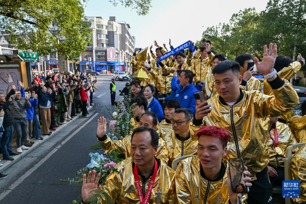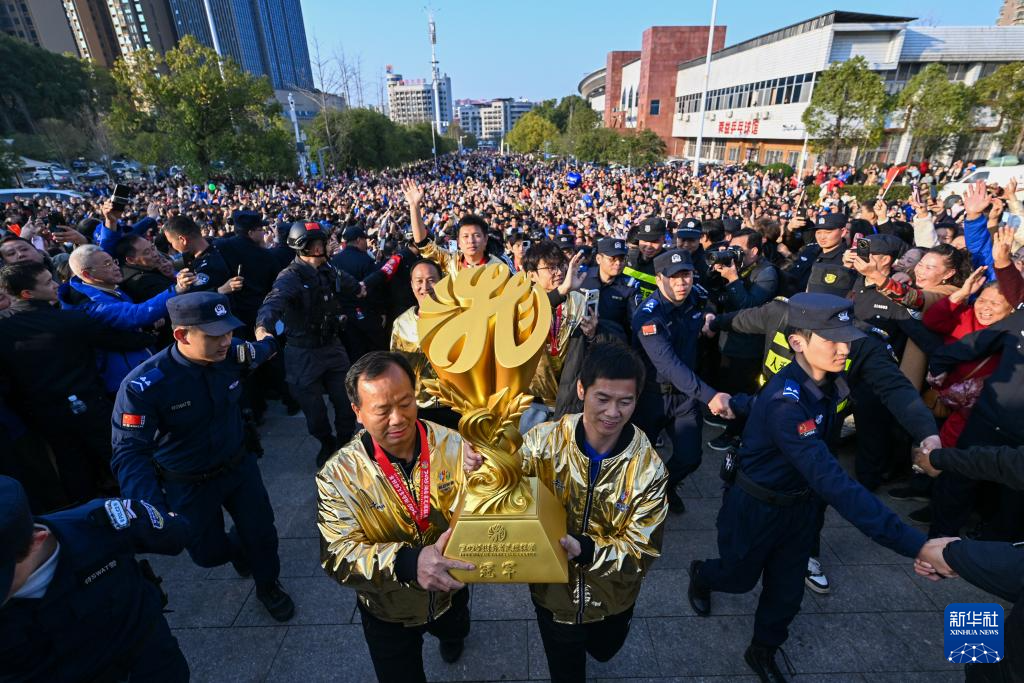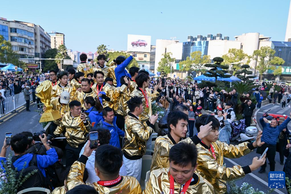 12月28日,永州队成员在巡游活动中手捧冠军奖杯回到主场。