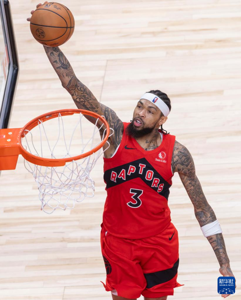 12月28日,猛龙队球员巴恩斯(中)在比赛中扣篮。