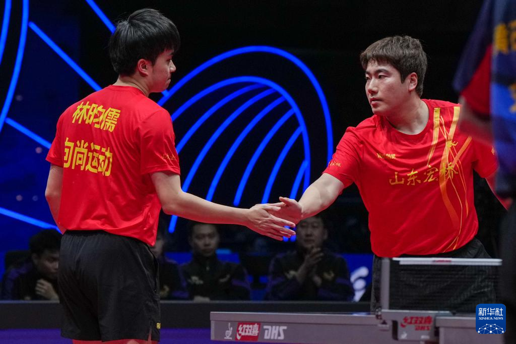 12月28日,山东魏桥·向尚运动队组合梁靖崑(右)/林昀儒在双打比赛中庆祝得分。他们3比0战胜黄石华新队组合薛飞/刘冠成。