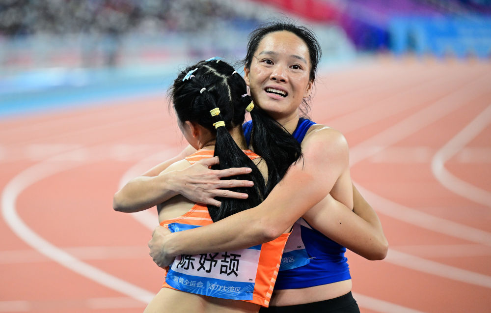 34岁的韦永丽在百米决赛后与16岁的冠军陈妤颉紧紧相拥