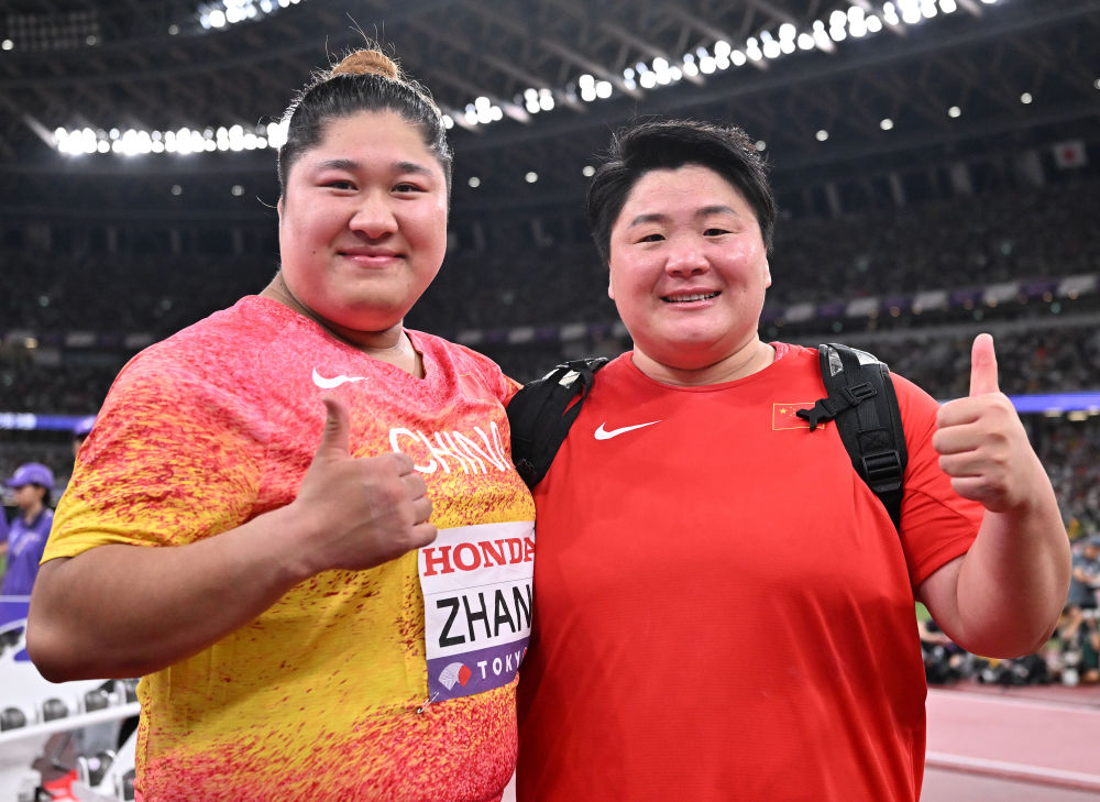 ↑9月20日,中国选手巩立姣(右)和张林茹在2025年世界田径锦标赛女子铅球决赛后合影。