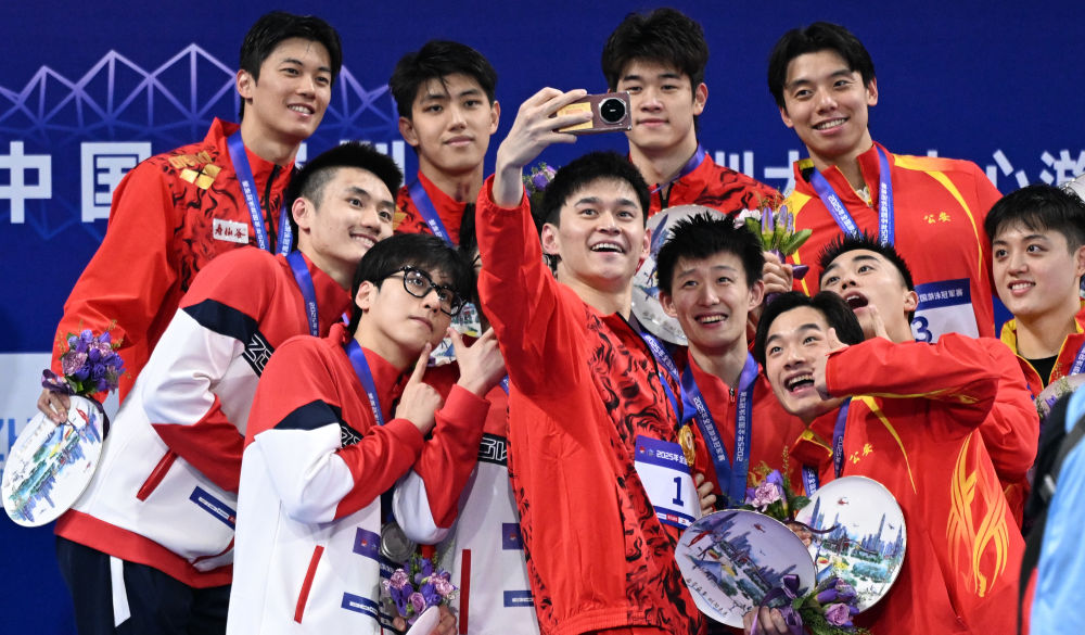 ↑5月22日,浙江寿仙谷队选手孙杨(中)在2025年全国游泳冠军赛男子4x200米自由泳接力颁奖仪式上与获奖运动员自拍合影。