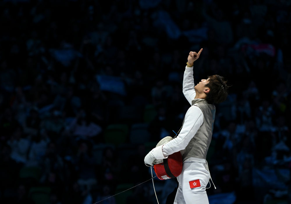 11月19日,香港队选手蔡俊彦在第十五届全运会男子花剑团体金牌赛中庆祝夺金。新华社记者 胡虎虎 摄