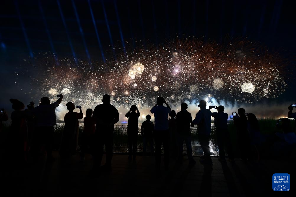 2025年8月7日,观众在开幕式上拍摄焰火表演。