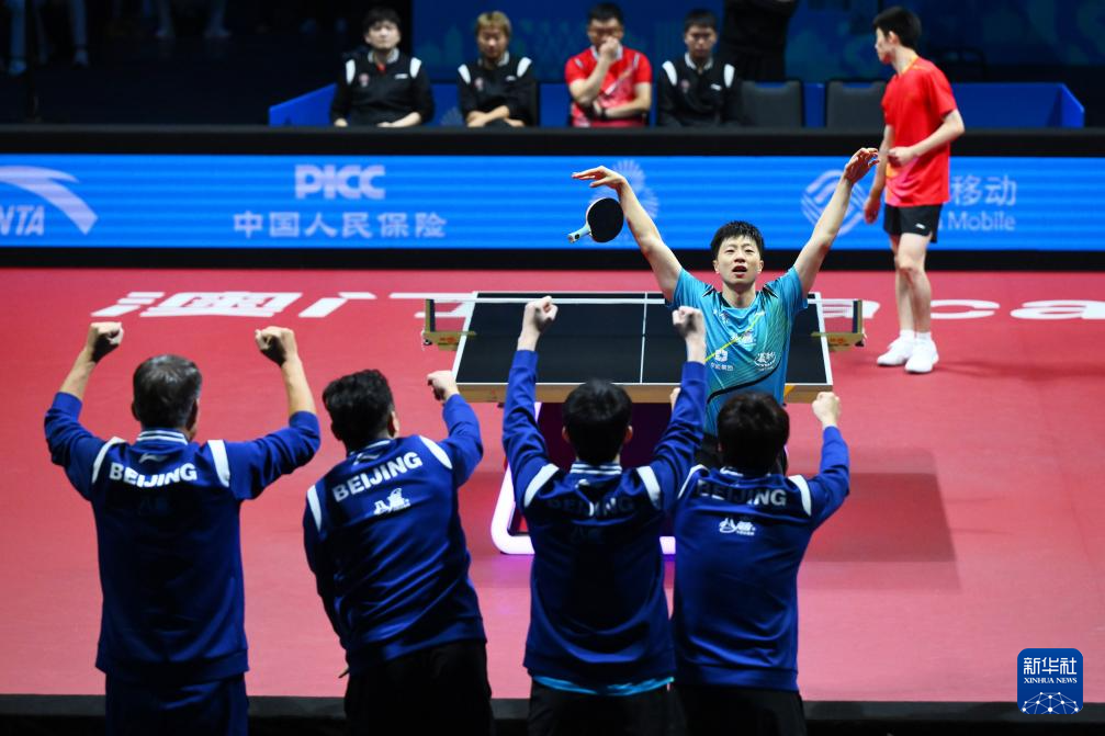 2025年11月20日,北京队选手马龙(中)庆祝男单比赛获胜。他3比0战胜上海队选手周恺。