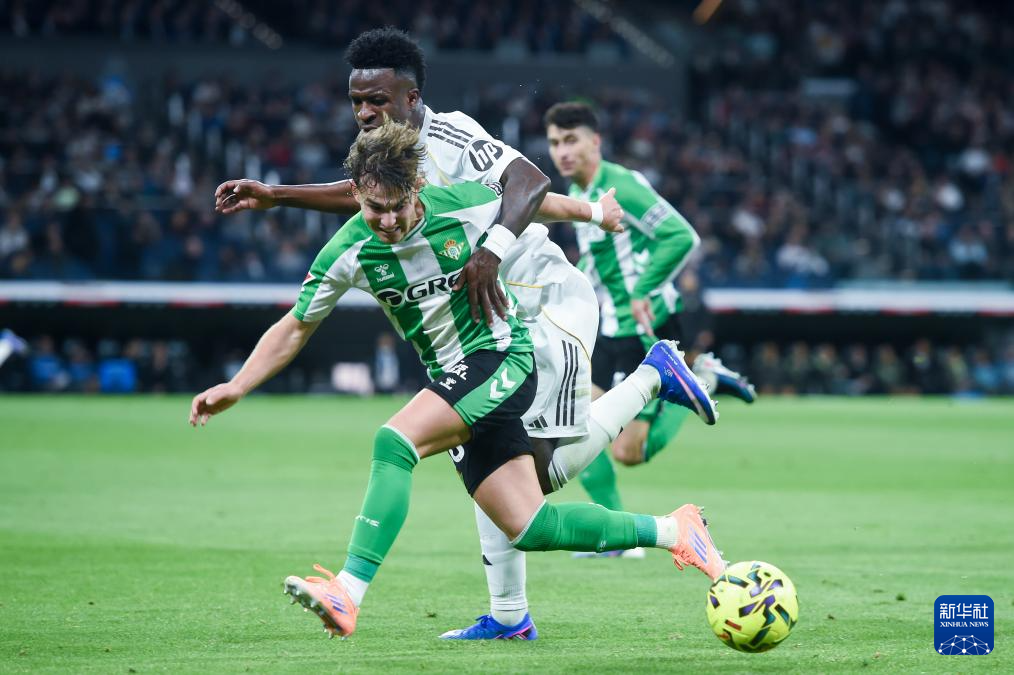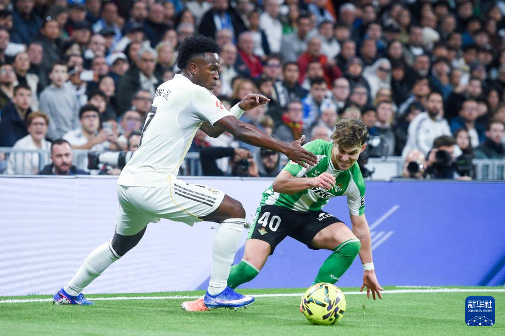 1月4日,皇家马德里队球员维尼修斯(左)和皇家贝蒂斯队球员安赫尔·奥尔帝斯拼抢。