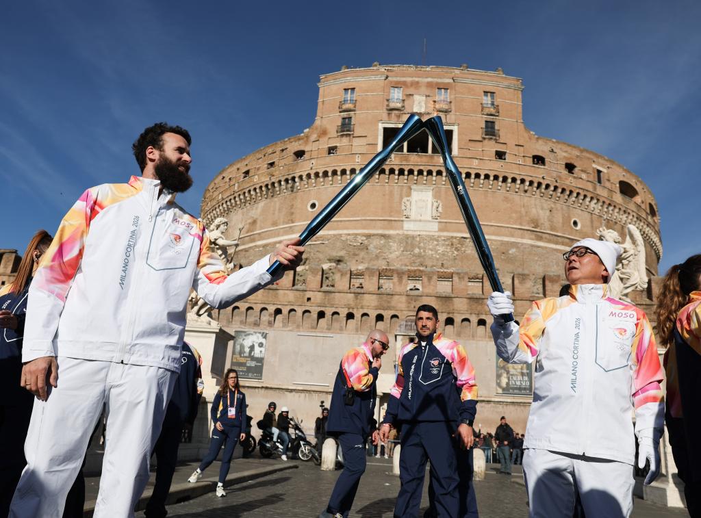 12月6日,在意大利罗马圣天使堡,火炬手、意大利篮球运动员路易吉·达托梅(左)与火炬手槙英俊在交接火炬。新华社记者 李京 摄