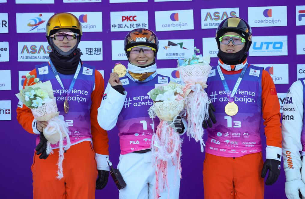 2025年12月21日,徐梦桃(中)在国际雪联自由式滑雪空中技巧世界杯(云顶站)混合团体项目颁奖仪式上。新华社发(武殿森摄)