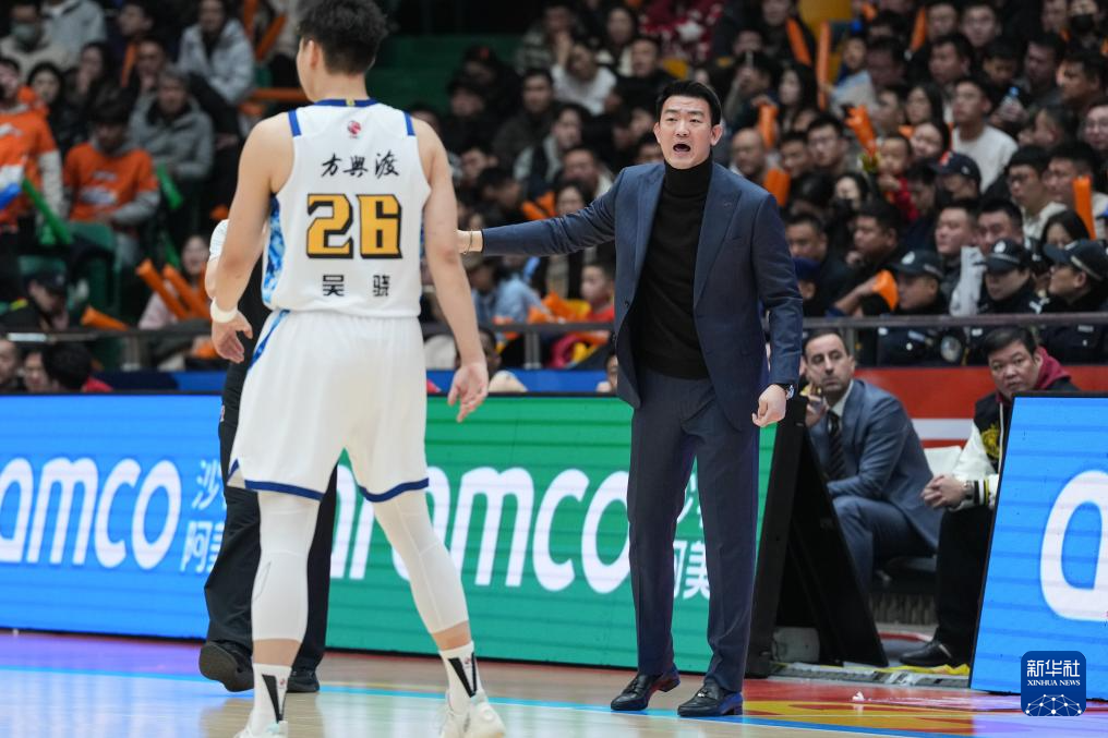 1月25日,山东高速队主教练邱彪在比赛中在场边指挥。
