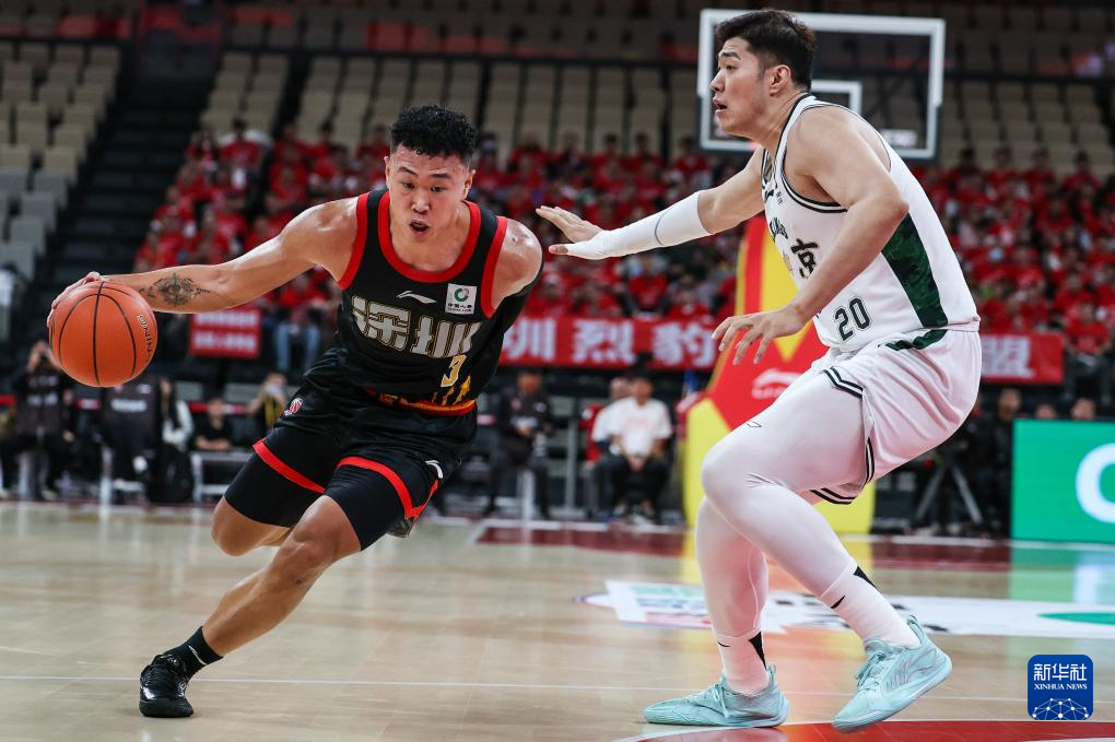 1月25日,深圳马可波罗队球员贺希宁(左)在比赛中带球突破。