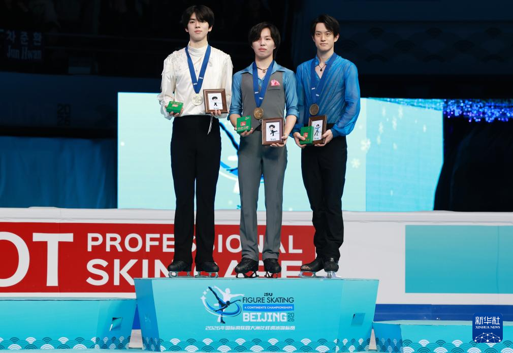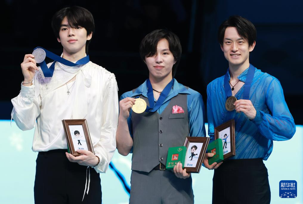 1月25日,男子单人滑冠军日本选手三浦佳生(中)、亚军韩国选手车俊焕(左)与季军日本选手山本草太在颁奖仪式上。