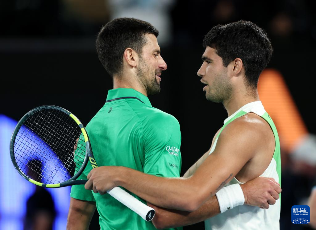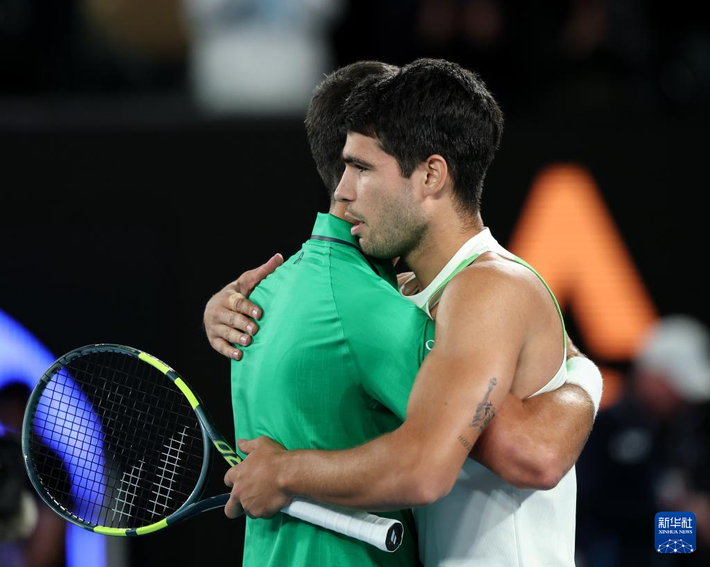 2月1日,阿尔卡拉斯(右)与焦科维奇赛后拥抱致意。