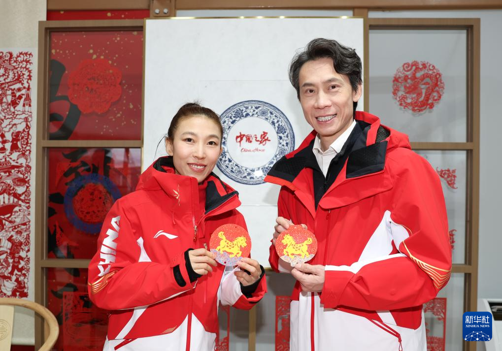 2月4日,花样滑冰世界冠军庞清(左)和佟健在冬奥会“中国之家”展示剪纸。