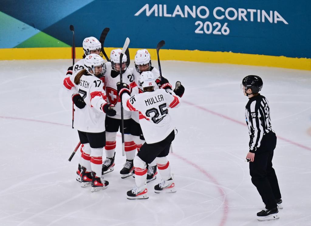 2月16日,瑞士队球员在比赛中庆祝得分。