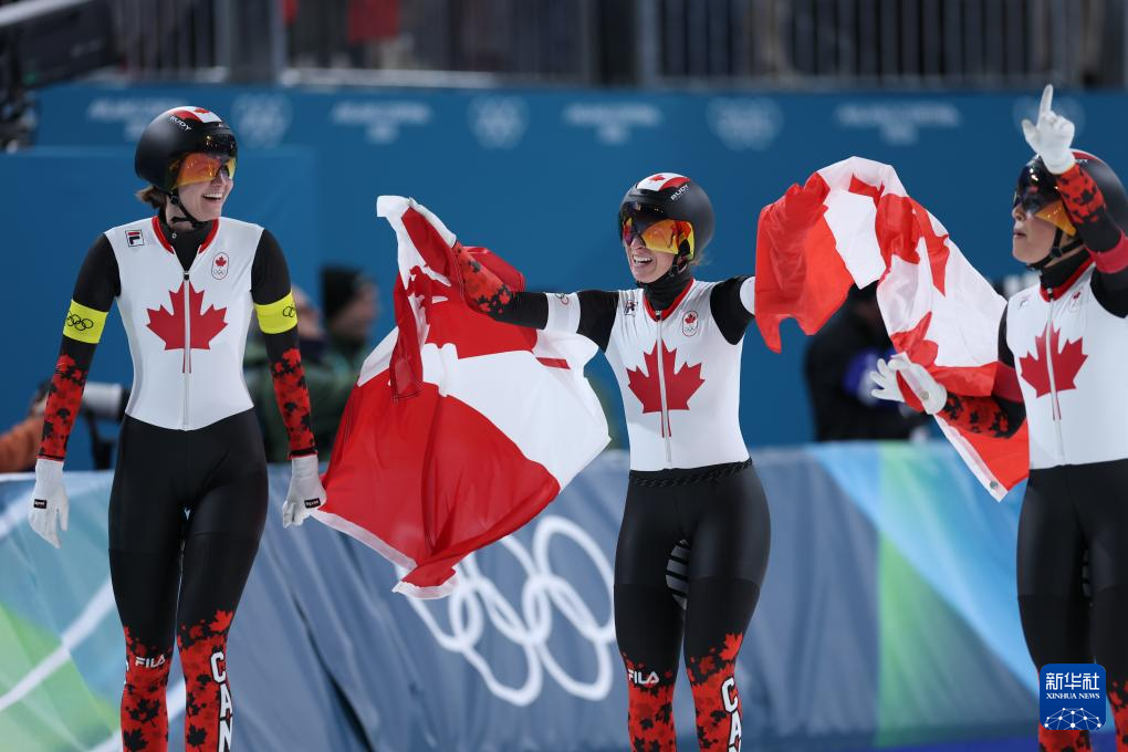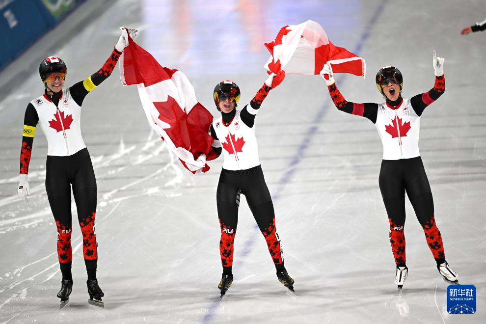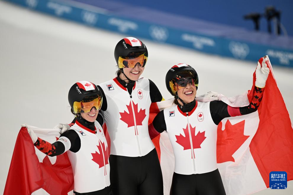 2月17日,加拿大队选手魏德曼、布隆丁、马尔泰(从左至右)在比赛后庆祝。