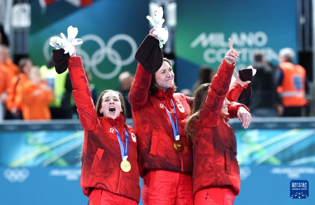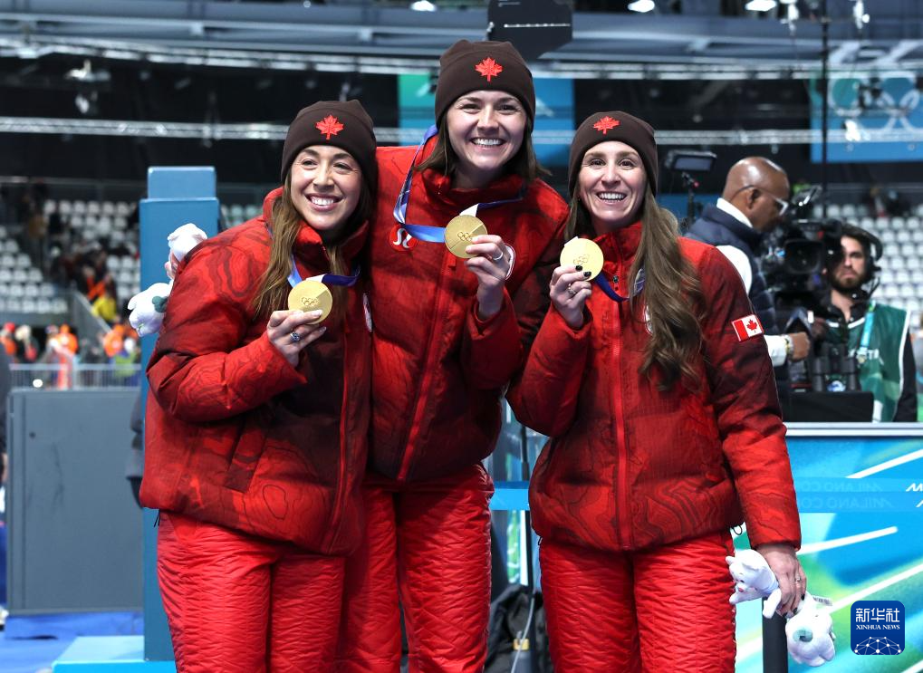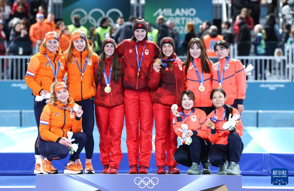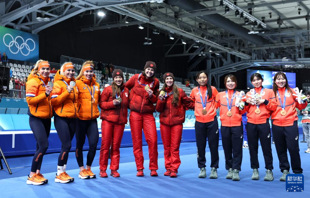 2月17日,冠军加拿大队(中),亚军荷兰队(左)和季军日本队在颁奖仪式上合影。