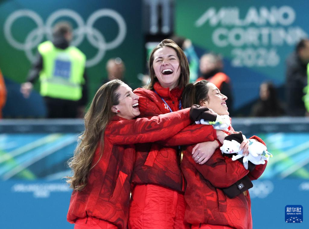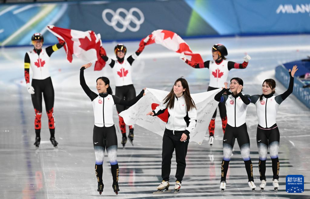 2月17日,季军日本队(前)和冠军加拿大队在赛后庆祝。
