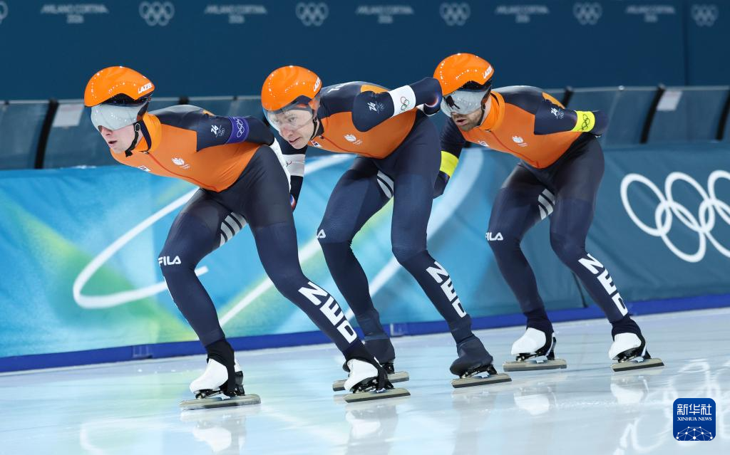 2月17日,荷兰队选手赖普马-德容、伯纳、格勒内沃德(从左至右)在比赛中。