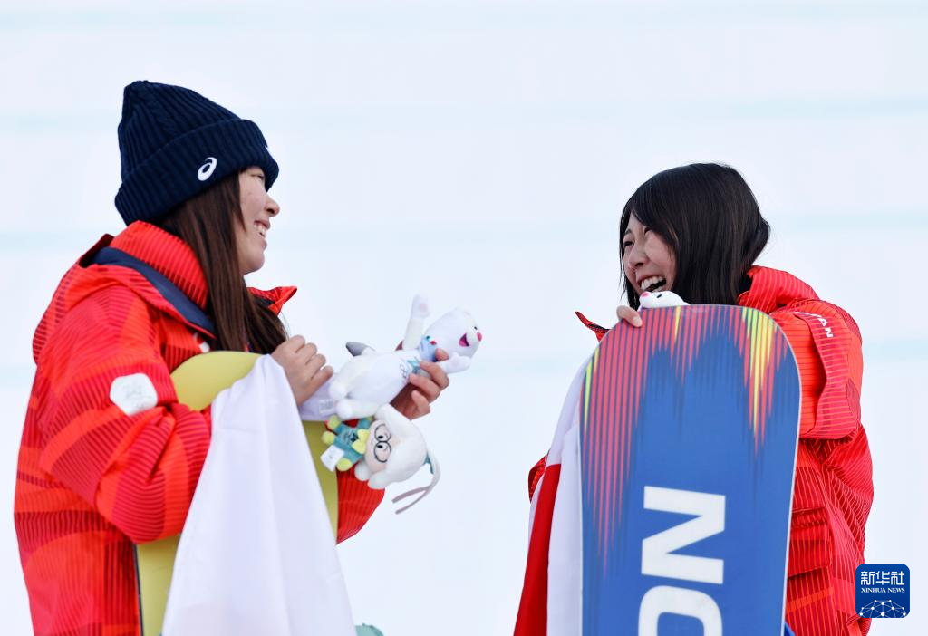 2月18日,冠军日本选手深田茉莉(中)、亚军新西兰选手萨多夫斯基(左)和季军日本选手村濑心椛在颁奖仪式上合影。