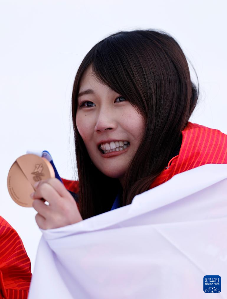 2月18日,季军日本选手村濑心椛在颁奖仪式上展示奖牌。
