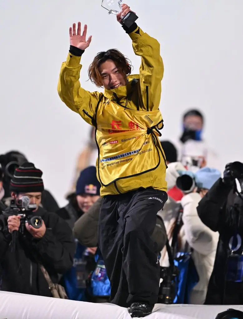 2025年12月6日,苏翊鸣在夺取2025-2026赛季国际雪联单板及自由式滑雪大跳台世界杯北京站单板滑雪大跳台男子组冠军后,向观众致意。新华社记者 陶希夷 摄