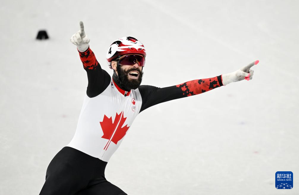 2月18日,加拿大队选手史蒂文·杜博伊斯(右)在比赛中率先冲线后庆祝。