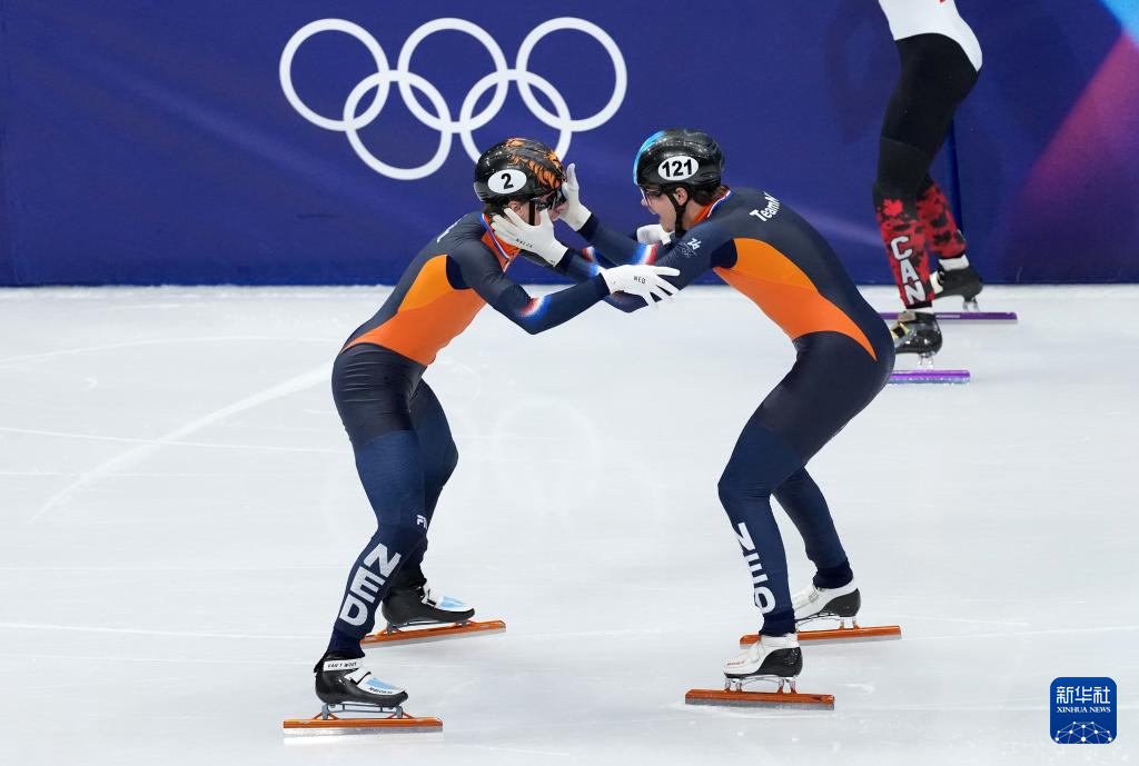 当地时间2月18日,在米兰-科尔蒂纳冬奥会短道速滑男子500米接力A组决赛中,加拿大队选手史蒂文·杜博伊斯、荷兰选手梅勒·范特·沃特和延斯·范特·沃特分获冠、亚、季军。