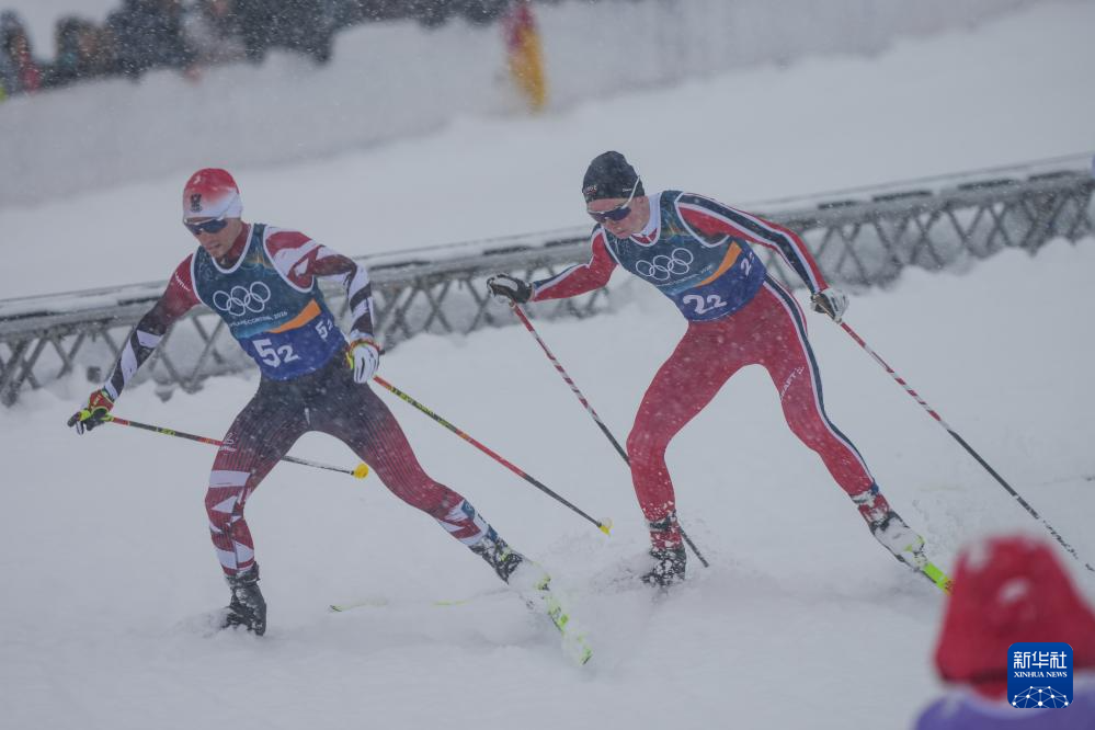 2月19日,挪威队选手奥夫特布罗(左)与芬兰选手希尔沃宁在比赛中即将冲线。