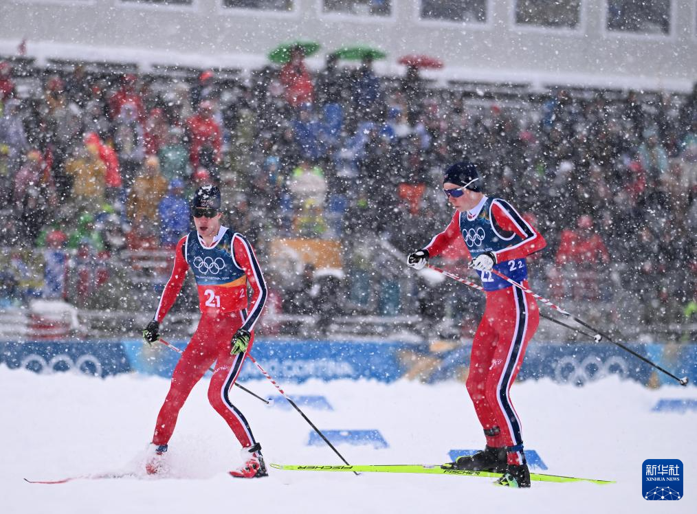 2月19日,挪威队选手奥夫特布罗(左)与斯科格隆在冲线后拥抱致意。