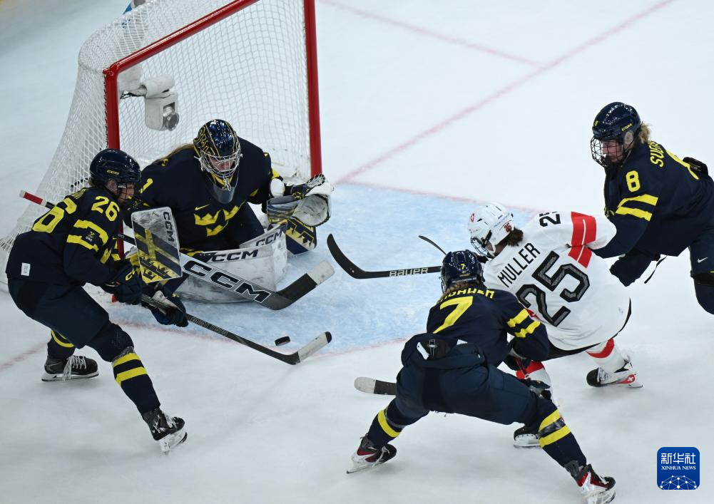 2月19日,瑞士队球员阿林娜·米勒(右二)在加时赛中攻入制胜球。