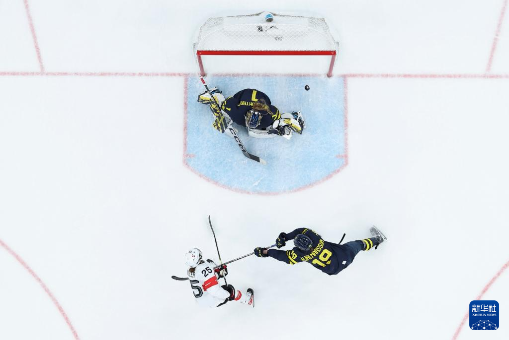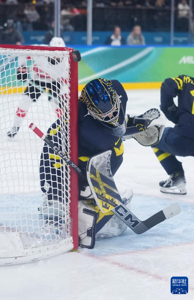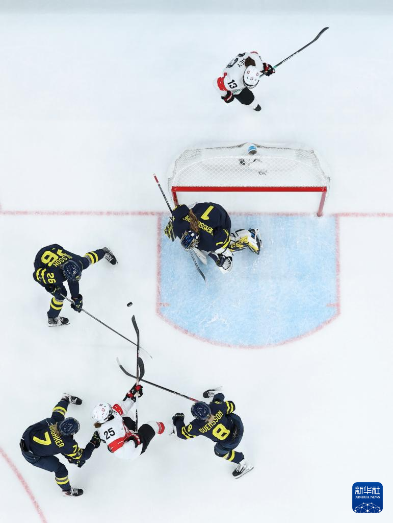 2月19日,瑞典队球员在比赛中庆祝进球。