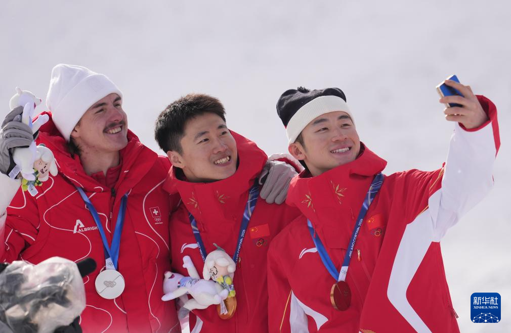 2月20日,冠军中国选手王心迪(中)、亚军瑞士选手罗特(左)、季军中国选手李天马在颁奖仪式上自拍合影。