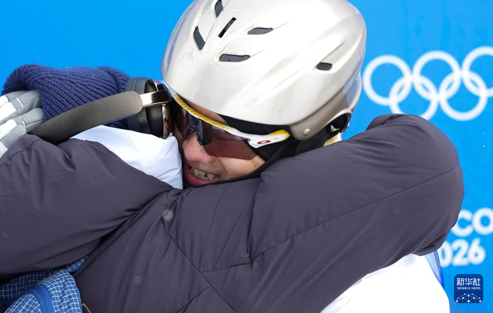 2月20日,王心迪(右)和妻子徐梦桃在比赛中拥抱。