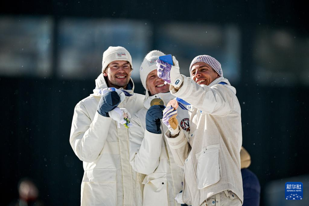 2月20日,亚军挪威选手斯图拉·霍尔姆·莱格雷德、冠军挪威选手约翰内斯·戴尔、季军法国选手康坦·菲永·马耶(从左到右)在颁奖仪式上自拍合影。