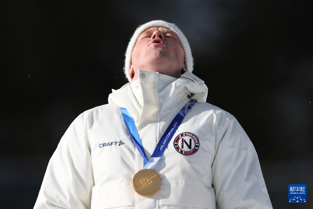 2月20日,亚军挪威选手斯图拉·霍尔姆·莱格雷德在颁奖仪式上庆祝。