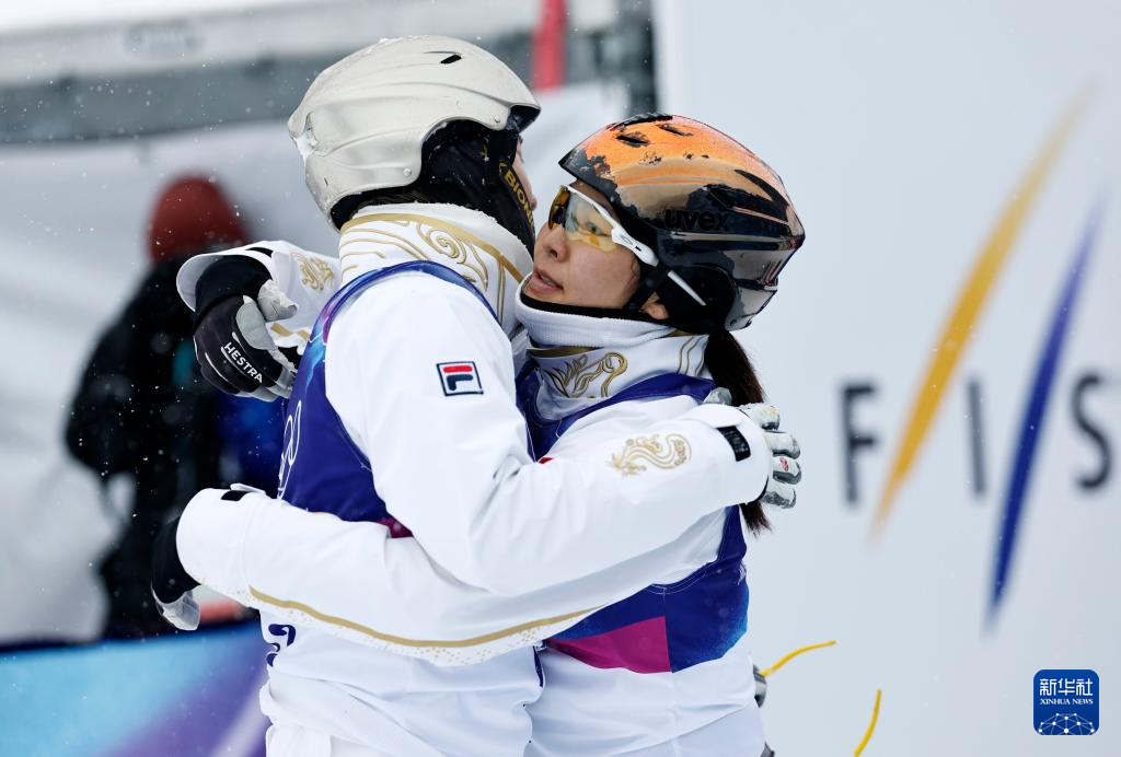 2月21日,中国队选手徐梦桃(左)在队友王心迪完成第二轮动作后。最终,中国队获得铜牌。