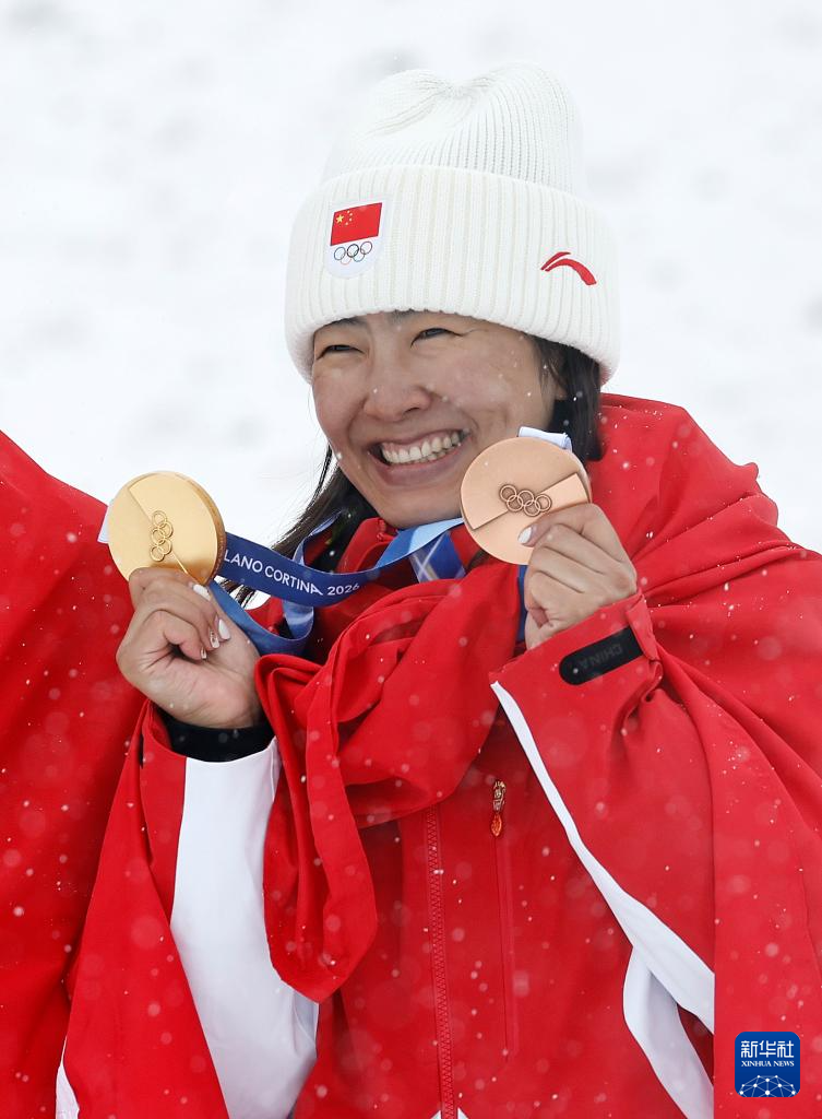 2月21日,中国队选手徐梦桃在颁奖仪式后展示自己在本届冬奥会取得的金牌和铜牌。