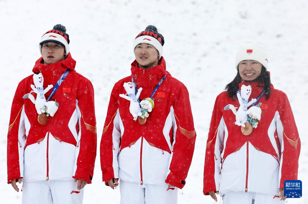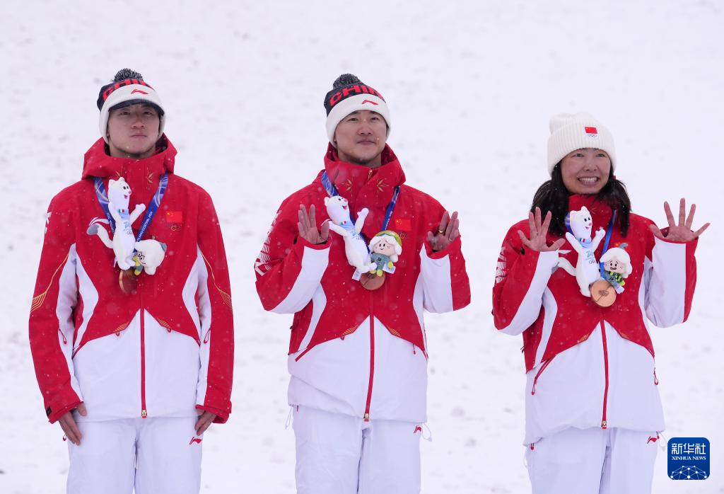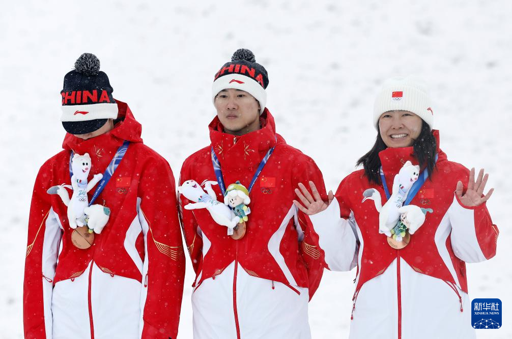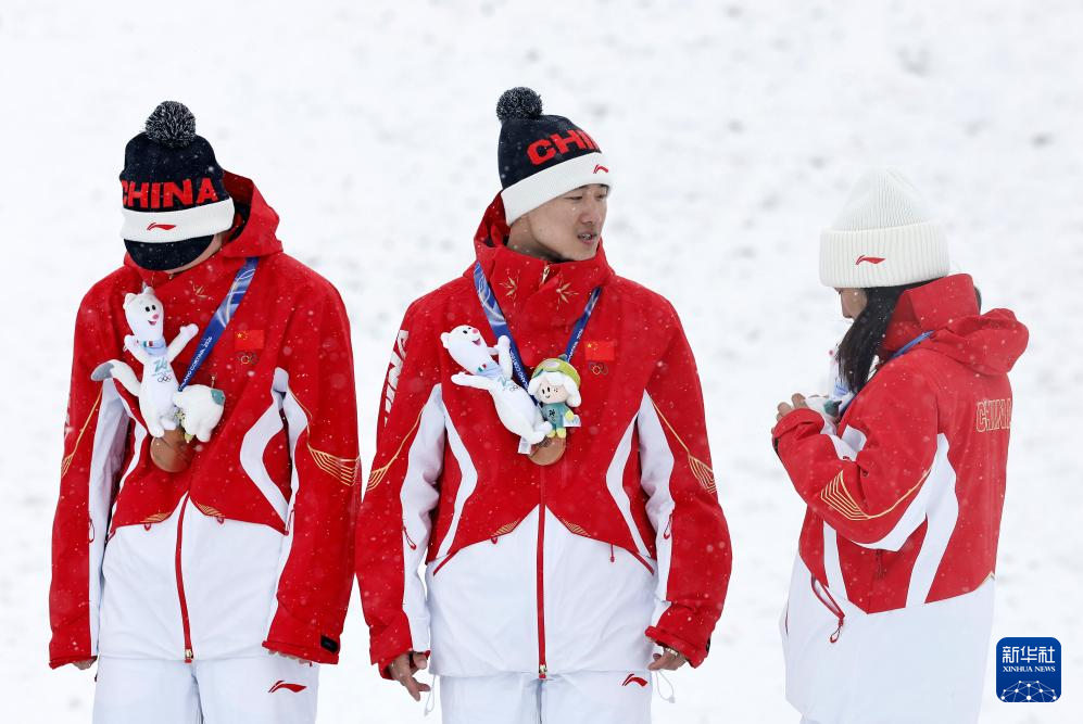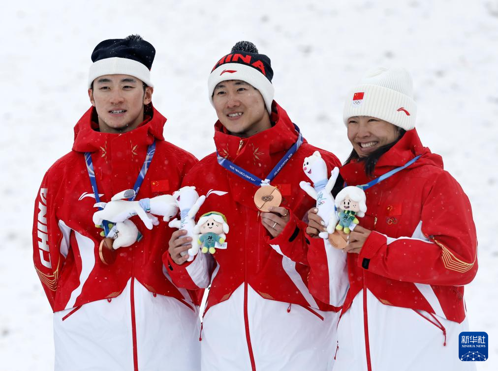 2月21日,中国队选手李天马(下)、徐梦桃(左)、王心迪在李天马第二轮比赛结束后。最终,中国队获得铜牌。