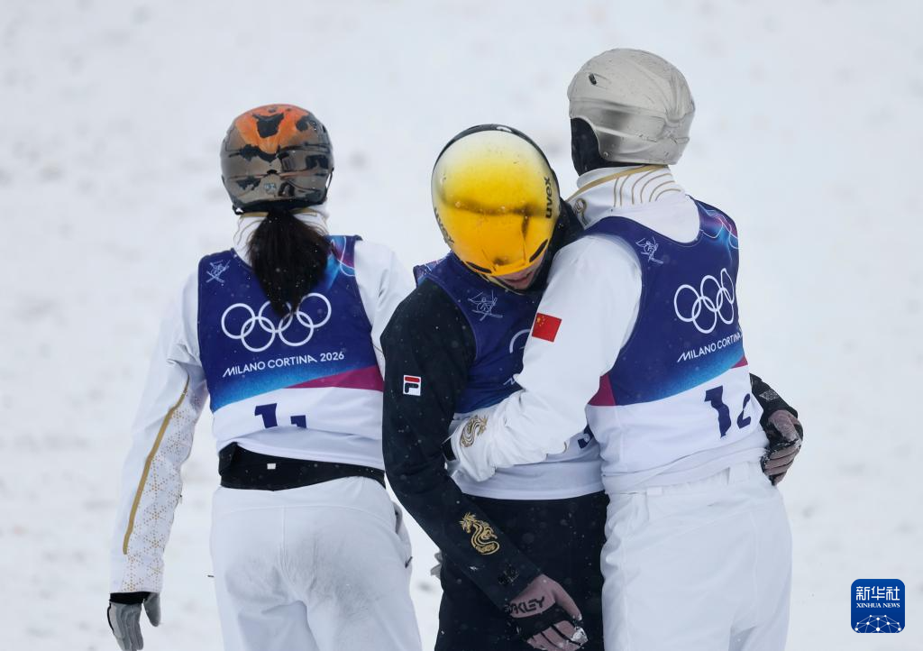 2月21日,中国队选手徐梦桃(左)、王心迪(右)安慰第二跳结束后的队友李天马。最终,中国队获得铜牌。