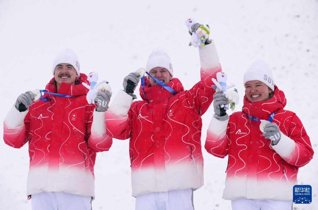 2月21日,中国队选手李天马、王心迪、徐梦桃(从前右至前左)在第二轮比赛后与瑞士队选手拥抱。最终,瑞士队、中国队分获银牌、铜牌。