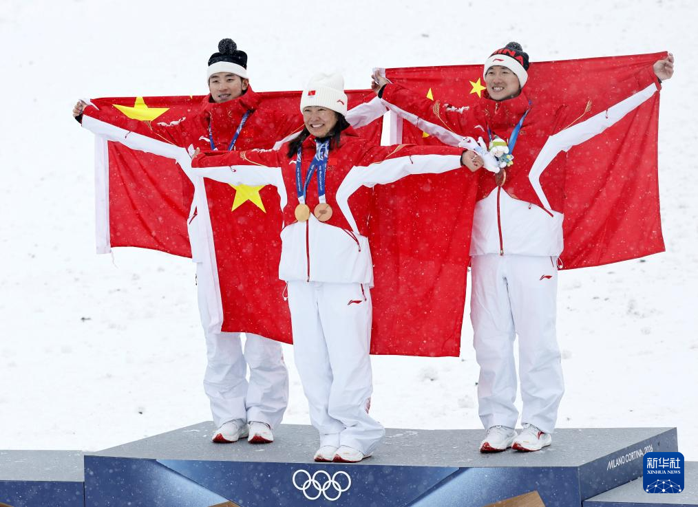 2月21日,季军中国队选手李天马、王心迪、徐梦桃(从左至右)在颁奖仪式上。