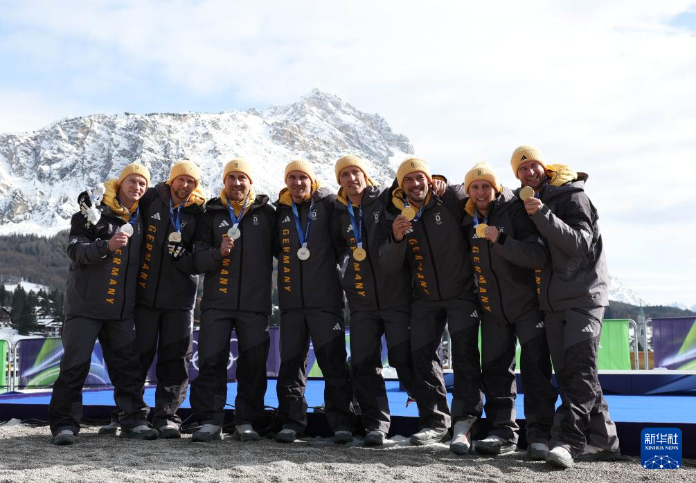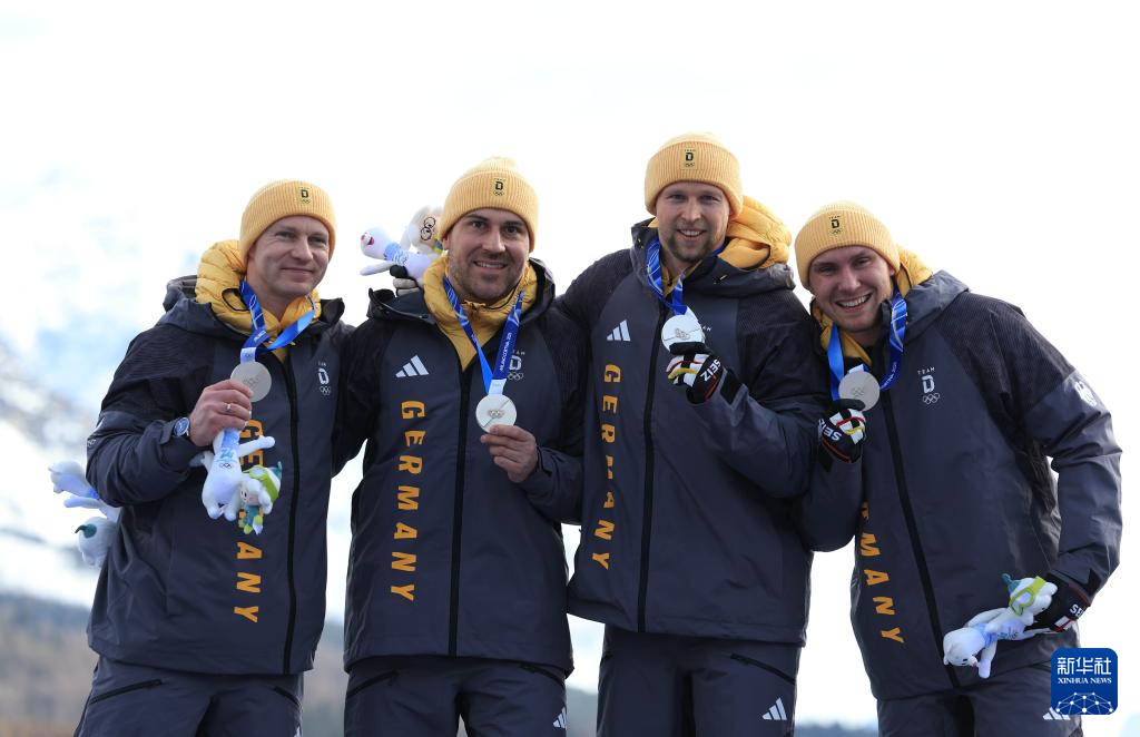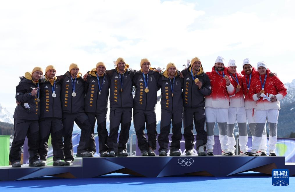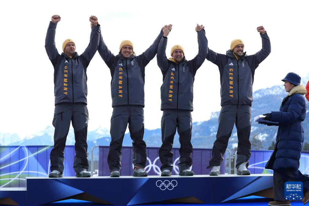 2月22日,亚军德国队选手弗朗西斯科·弗里德里希/亚历山大·舒勒/费利克斯·施特劳布/马蒂亚斯·佐默和冠军德国队选手托尔斯滕·马吉斯/格奥尔格·弗莱施豪尔/约恩·文策尔/约翰内斯·洛赫纳(从左到右)在颁奖仪式上合影。
