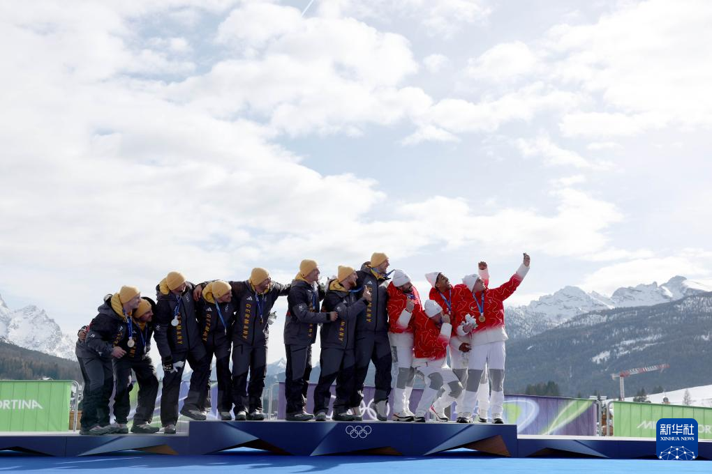 2月22日,亚军德国队选手弗朗西斯科·弗里德里希/马蒂亚斯·佐默/亚历山大·舒勒/费利克斯·施特劳布、冠军德国队选手约翰内斯·洛赫纳/托尔斯滕·马吉斯/约恩·文策尔/格奥尔格·弗莱施豪尔、季军瑞士队选手米夏埃尔·福格特/安德烈亚斯·哈斯/阿马杜·戴维·恩迪亚耶/马里奥·艾贝哈德(从左到右)在颁奖仪式上自拍。