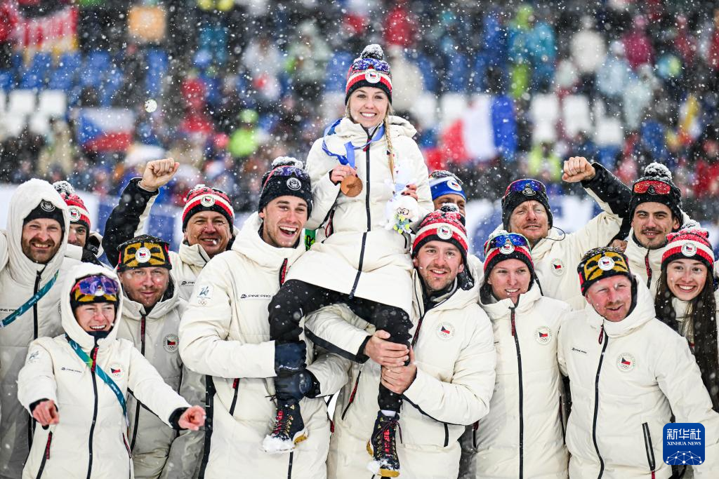 2月21日,季军捷克选手沃博尔尼科娃(上)与队友在颁奖仪式后合影。