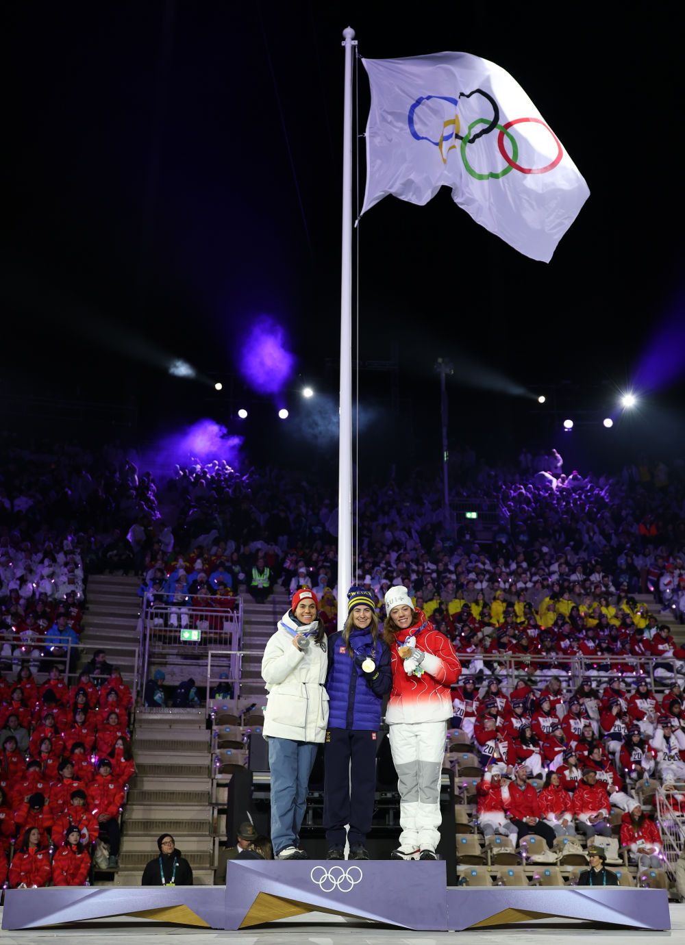 ↑越野滑雪女子50公里集体出发(传统技术)冠军瑞典选手埃芭·安德森(中)、亚军挪威选手海蒂·文格(左)、季军瑞士选手娜迪亚·凯林在闭幕式上的颁奖仪式中合影。