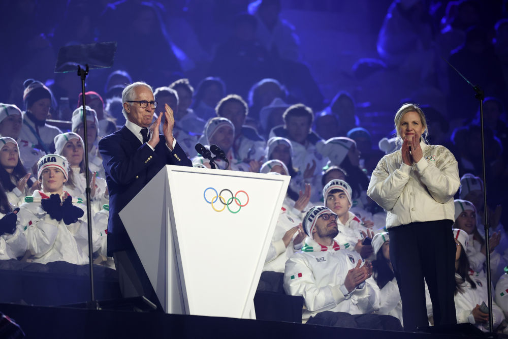 ↑米兰-科尔蒂纳丹佩佐冬奥会组委会主席乔瓦尼·马拉戈和国际奥委会主席考文垂在闭幕式上。