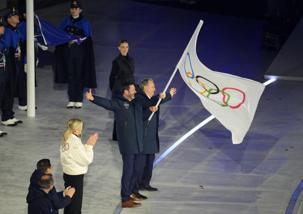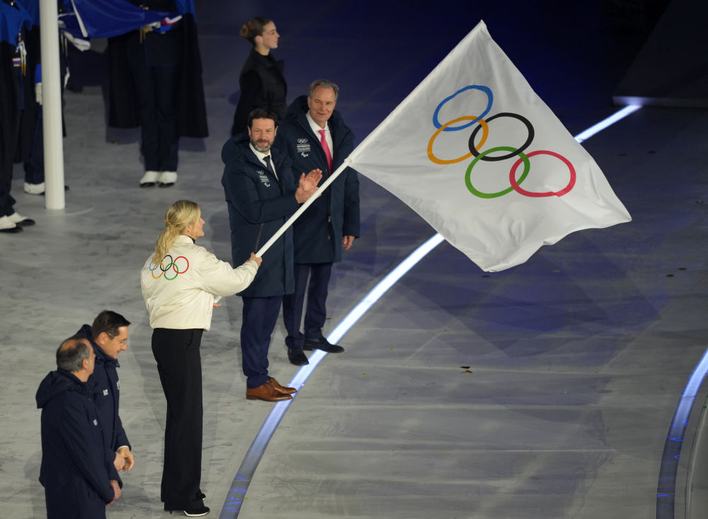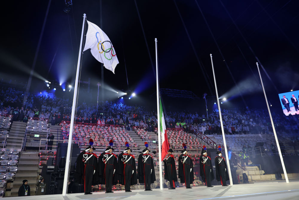 ↑意大利国旗与国际奥委会会旗在闭幕式现场升起。