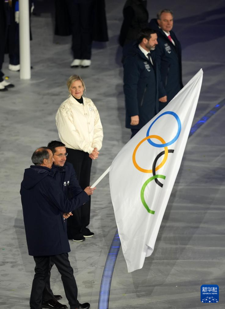 2月22日,国际奥委会主席考文垂(左三)在奥林匹克会旗交接仪式上挥动五环旗。