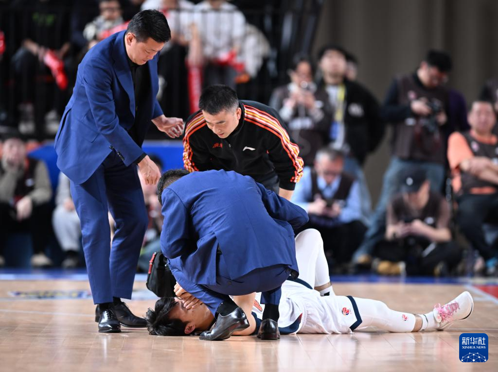 3月11日,广东东阳光队球员徐杰(下)在比赛中倒地。