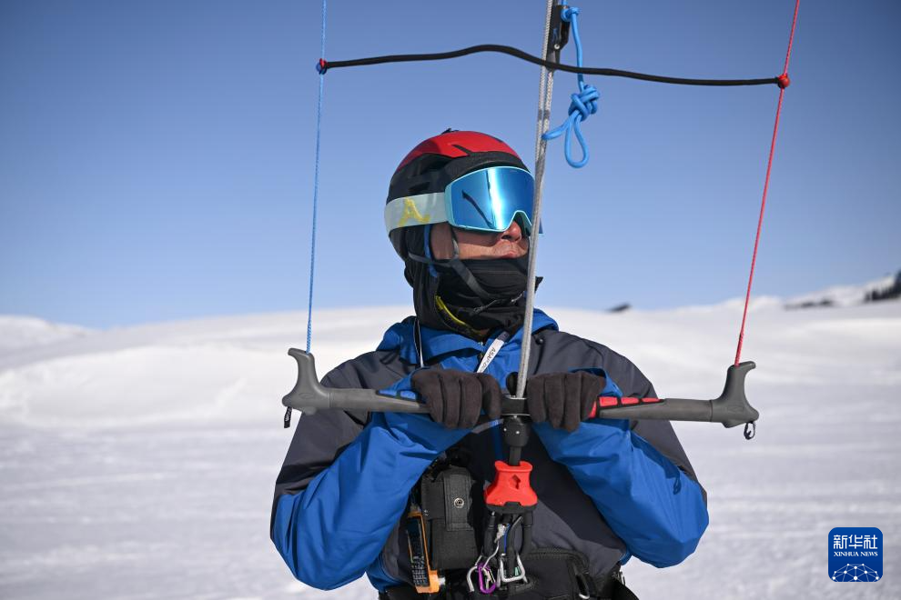 在新疆伊犁河谷东部山区,程鹏调整风筝方位准备滑行(3月15日摄)。